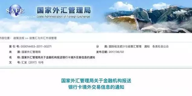 6月2日,外管局官方網站發(fā)布了《國家外匯管理局關于金融機構報送銀行卡境外交易信息的通知》,通知寫道,為加強銀行卡境外交易監(jiān)測管理,維護銀行卡境外交易秩序,外管局決定開展銀行卡境外交易信息采集工作,自2017年9月1日起施行。