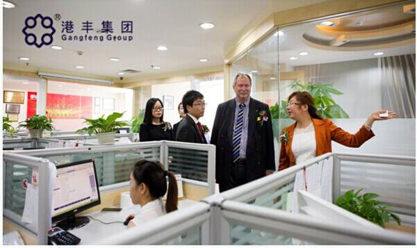 座談會(huì)后港豐集團(tuán)CEO魏曉嶸帶領(lǐng)阿聯(lián)酋哈伊馬角政府投資局董事局總經(jīng)理Mr. Peter-Michael Shuster一行參觀了港豐集團(tuán)深圳公司辦公區(qū)域。面對(duì)深圳港豐一流的辦公環(huán)境Mr. Peter-Michael Shuster感慨的說“我17年前就來過中國(guó),今天的中國(guó)變化真是太大了,我喜歡中國(guó),中國(guó)是一片充滿機(jī)會(huì)的熱土。也非常喜歡港豐,港豐是一個(gè)國(guó)際化品牌公司”